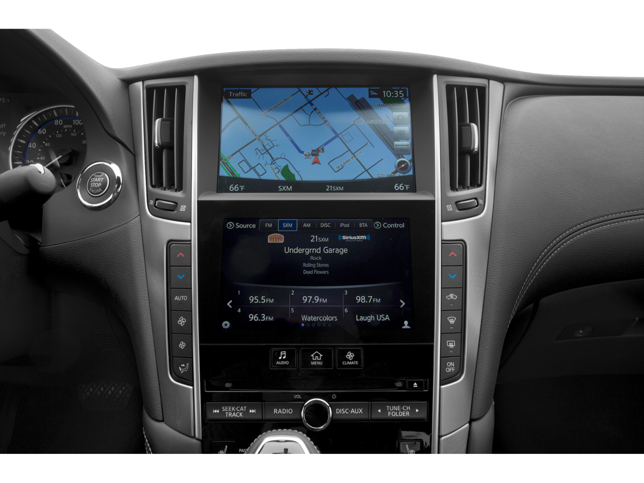 - Radio: AM/FM HD Radio -inc: Bose performance series 13-speaker premium audio system w/genuine metal speaker grilles, CD, MP3 playback, speed-sensitive volume control, Bluetooth® hands-free phone system w/hands-free text messaging assistant plus, 2 USB connection ports for iPod interface, flash drive, and other compatible devices, auxiliary input jacks, SiriusXM satellite radio w/90-day trial subscription, Travel Link w/4-year complimentary subscription, Bluetooth® streaming audio, steering wheel-mounted audio controls, INFINITI voice recongition for audio and vehicle information systems, INFINITI InTouch navigation, INFINITI InTouch services w/6-month trial, voice recognition for audio and SiriusXM Traffic w/4-year complimentary trial access to real-time traffic information
